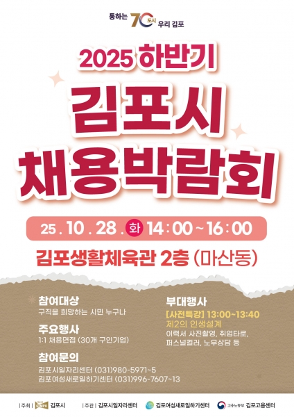 [한국Q뉴스] 김포시는 오는 10월 28일 오후 2시, 마산동 김포생활체육관에서 ‘2025년 하반기 김포시채용박람회’를 개최한다.