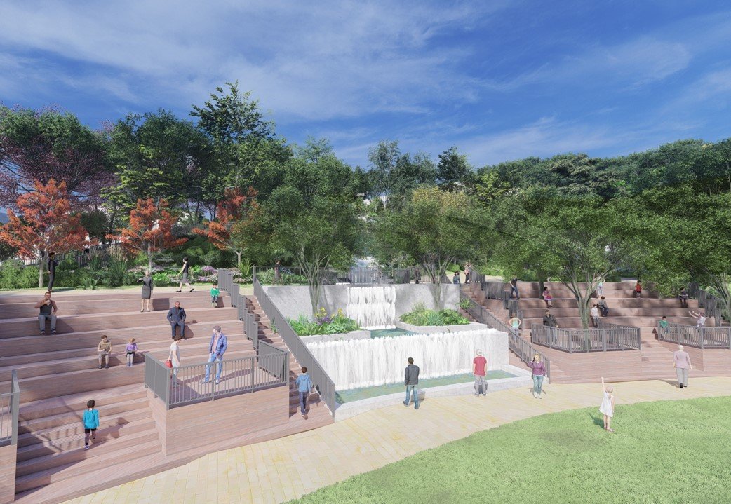 또한, 워터쿨러테라스는 기존의 계단식 스탠드석과 수목을 최대한 유지하고 지형적 높낮이를 활용해 데크와 전망공간, 수공간을 더한다.