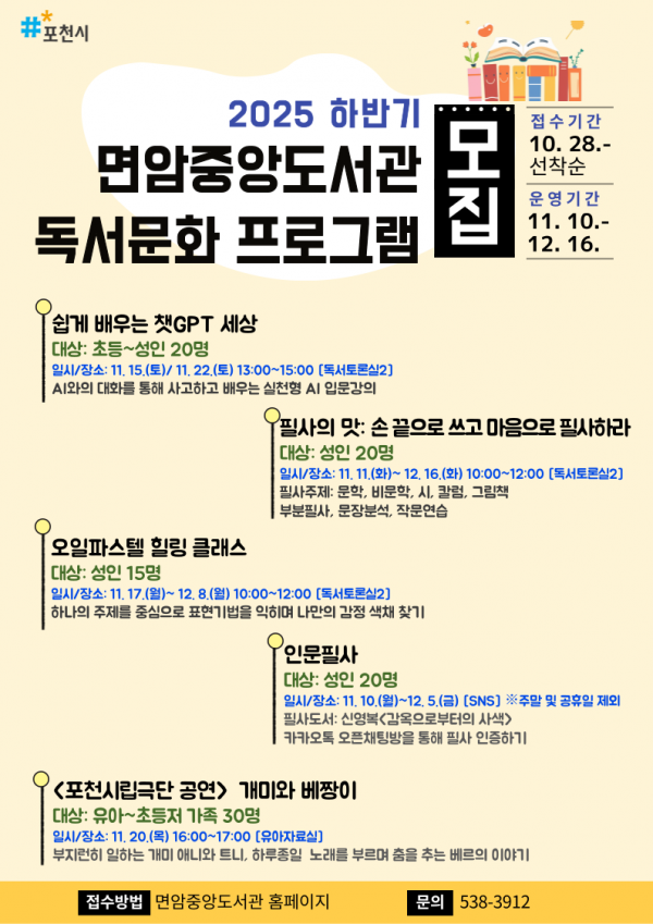 [한국Q뉴스] 포천시 면암중앙도서관은 오는 11월 16일부터 하반기 독서문화프로그램을 운영한다.