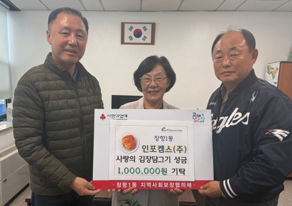 [한국Q뉴스] 고양특례시 일산동구 장항1동은 지난 24일 화학제품 수출입전문업체인 ‘인포켐스’로부터 사랑의 김장담그기 행사 후원금 100만원을 전달 받았다고 밝혔다.