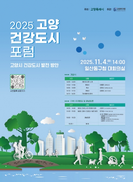 [한국Q뉴스] 고양특례시는 오는 11월 4일 일산동구청 대회의실에서 ‘2025 고양 건강도시 포럼’을 개최한다고 밝혔다.