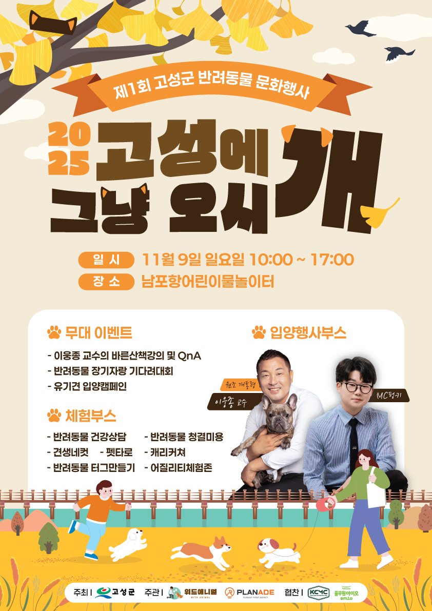 [한국Q뉴스] 고성군(군수 이상근)은 오는 11월 9일 일요일 오전 10시, 남포항 일원(어린이 물놀이터 입구)에서 제1회 반려동물 문화행사 ‘고성에 그냥 오시개’를 개최한다고 밝혔다.