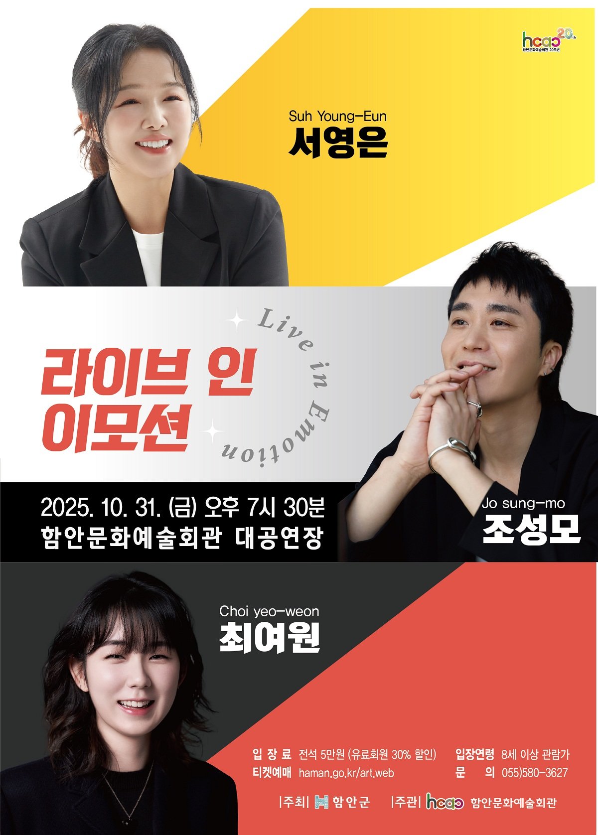 함안문화예술회관 관계자는 “이번 조성모·서영은·최여원의 ‘라이브 인 이모션(Live in Emotion)’콘서트는 군민과 함안을 찾아주신 관객들에게 가을밤의 낭만을 선사하고 잊지 못할 추억을 전하고자 기획됐다”며 “가족, 연인, 친구와 함께 깊어가는 가을의 정취를 만끽하시길 바란다”고 말했다.