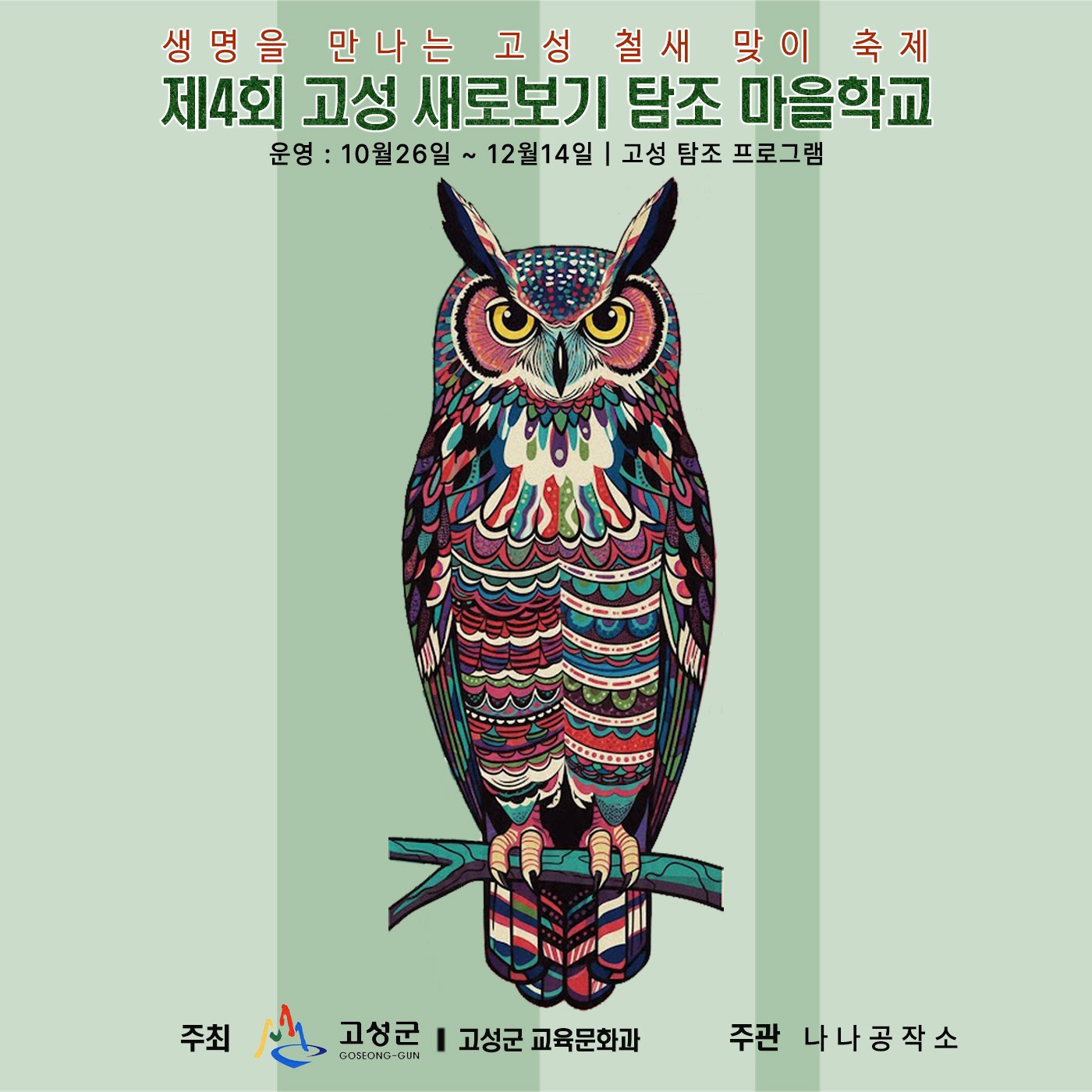 ‘새로보기 탐조 마을학교’는 고성의 천연기념물과 철새를 직접 관찰하며 환경의 가치를 이해하고 생태 보전 의식을 높이는 주민 자율형 프로그램으로 철새 탐조 활동, 생태 예술 체험, 전문가 강연 등 총 10회 과정으로 운영된다.