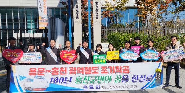 [한국Q뉴스] 홍천군 토목직 공무원 모임은 10월 28일 홍천군민의 100년 염원인 용문~홍천 광역철도의 예비타당성조사 통과와 조기 착공을 염원하는 세종시 릴레이 홍보활동을 추진했다고 밝혔다.