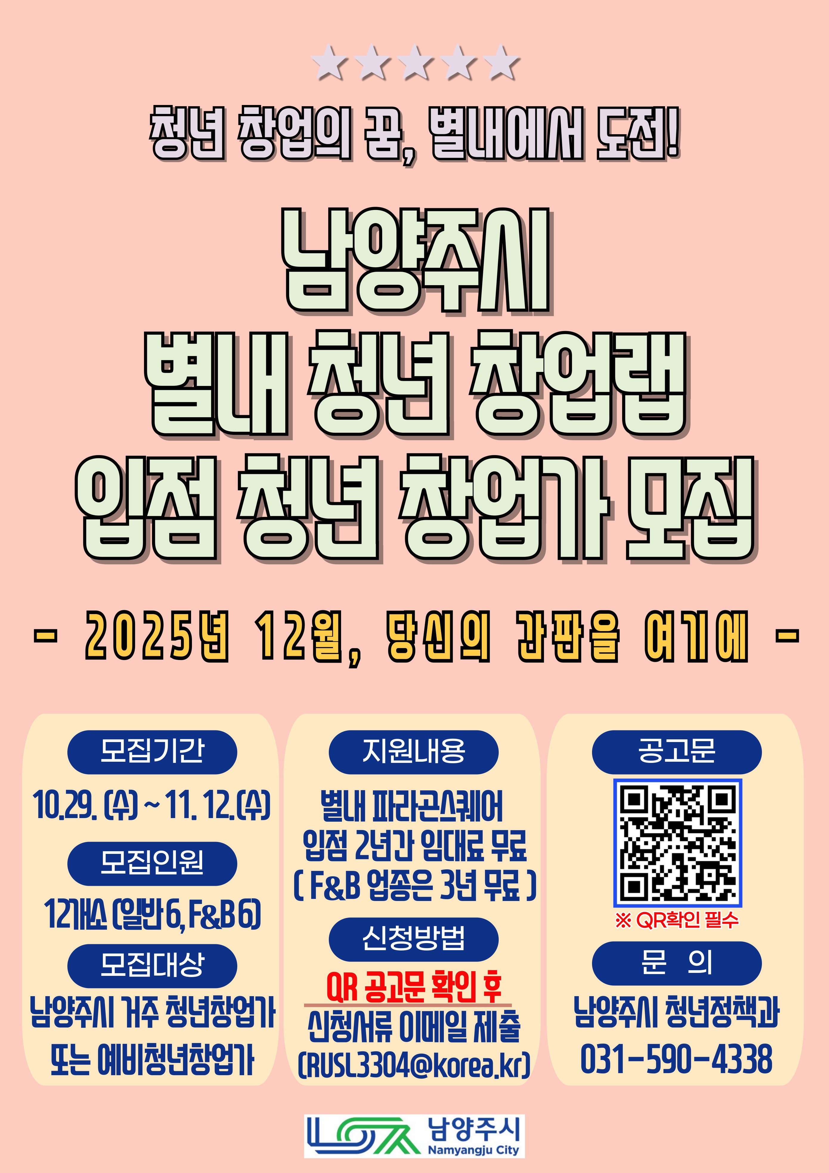 [한국Q뉴스] 남양주시(시장 주광덕)는 29일부터 청년 창업가들을 위한 ‘남양주시 별내 청년 창업랩’입점자를 공개 모집한다.