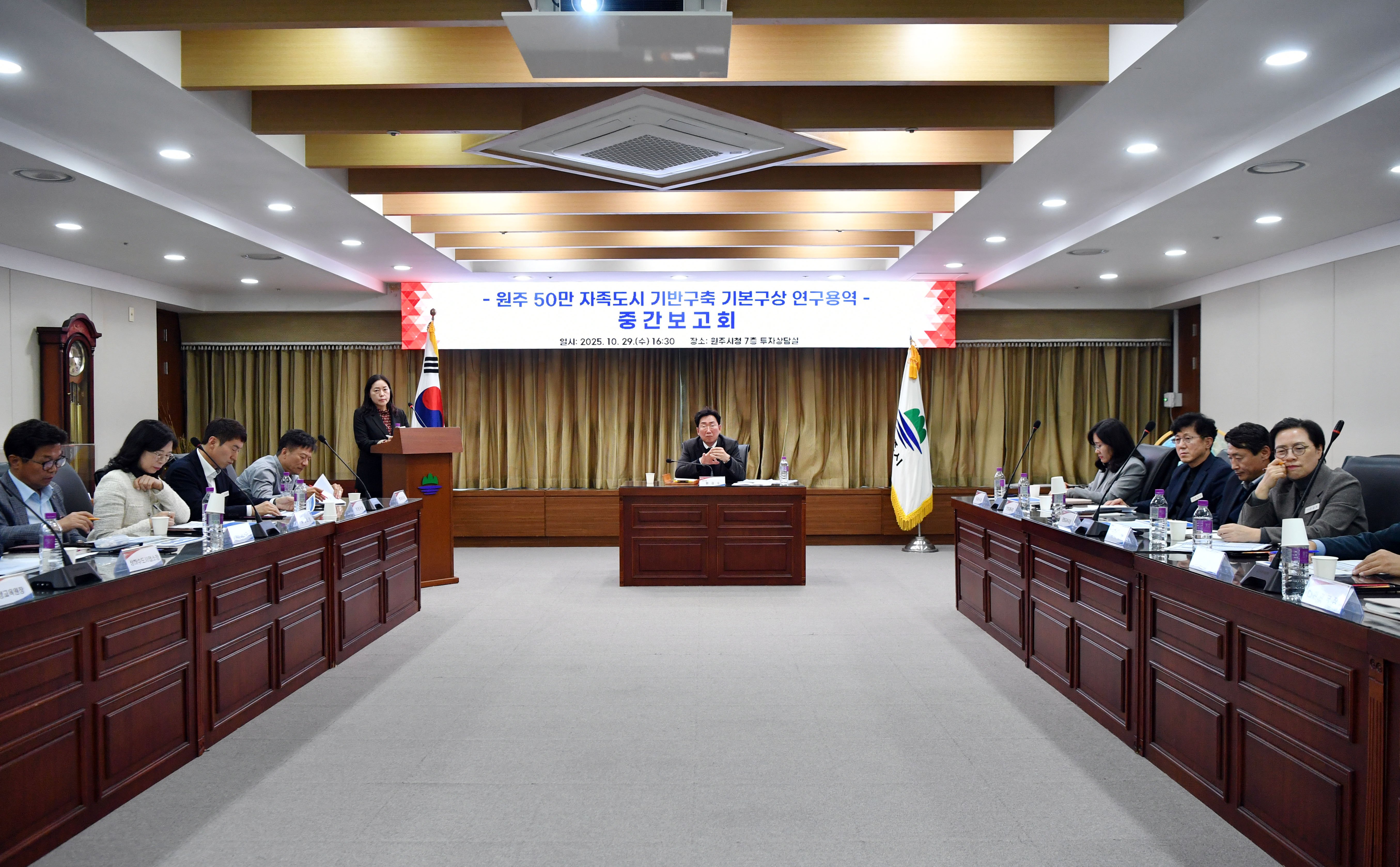 [한국Q뉴스] 원주시는 29일 시청 7층 투자상담실에서 ‘원주 50만 자족도시 기반구축 기본구상 연구용역’중간보고회를 개최했다.