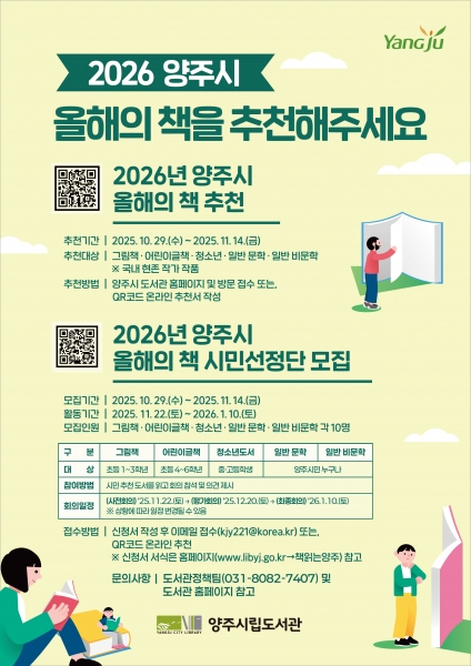 양주시 관계자는 “올해의 책을 통해 시민들이 함께 읽고 소통하며 독서의 가치와 즐거움을 느낄 수 있길 바란다”며 “2026년 양주시 올해의 책 추천에 시민 여러분의 적극적인 관심과 참여를 부탁드린다”고 전했다.