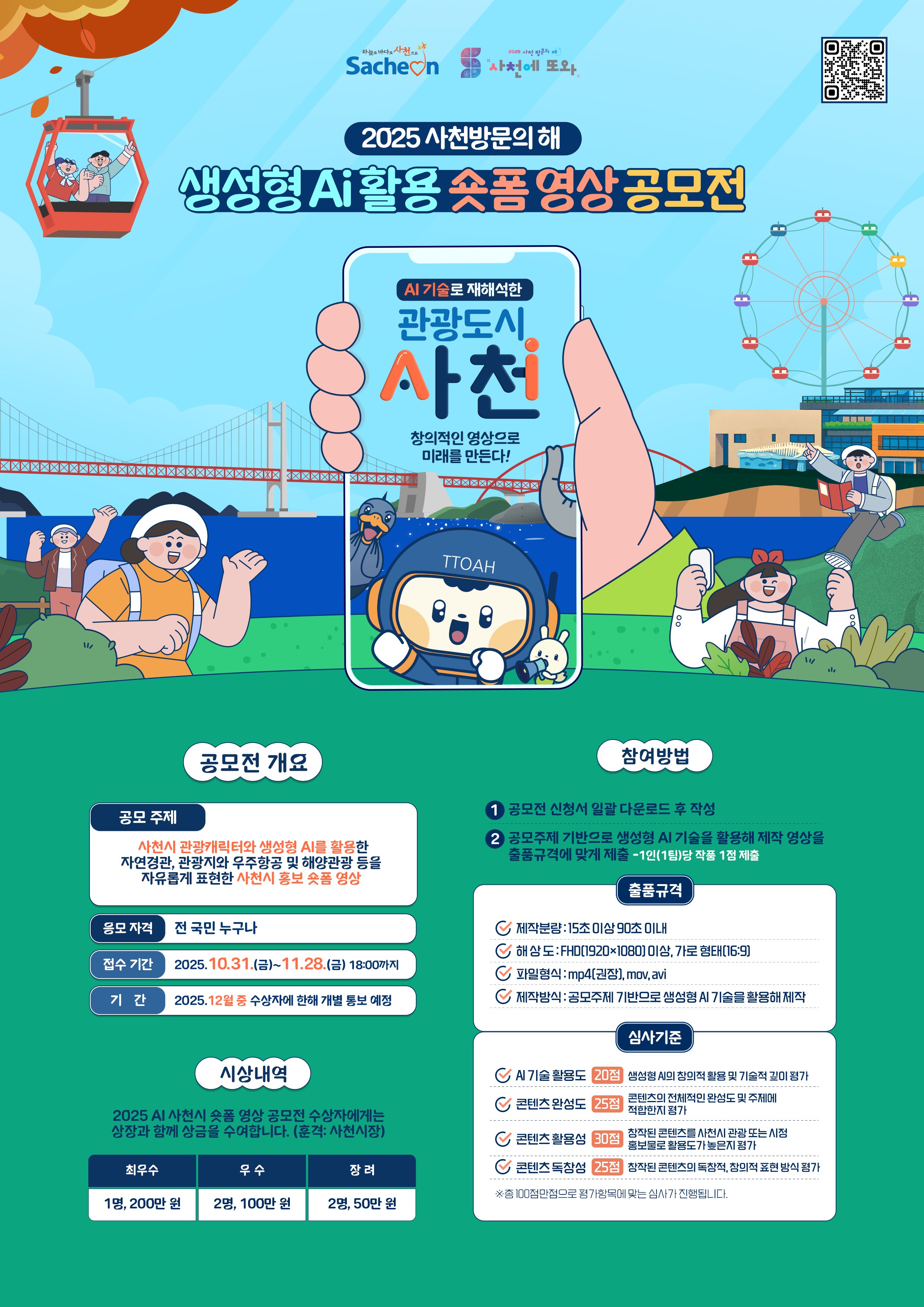 [한국Q뉴스] 사천시(시장 박동식)는 2025 사천방문의 해를 맞아 시의 관광자원과 관광 캐릭터에 대한 관심과 인지도를 제고하기 위한 생성형 AI 활용 숏폼 영상 공모전을 10월 31일부터 11월 28일까지 개최한다.