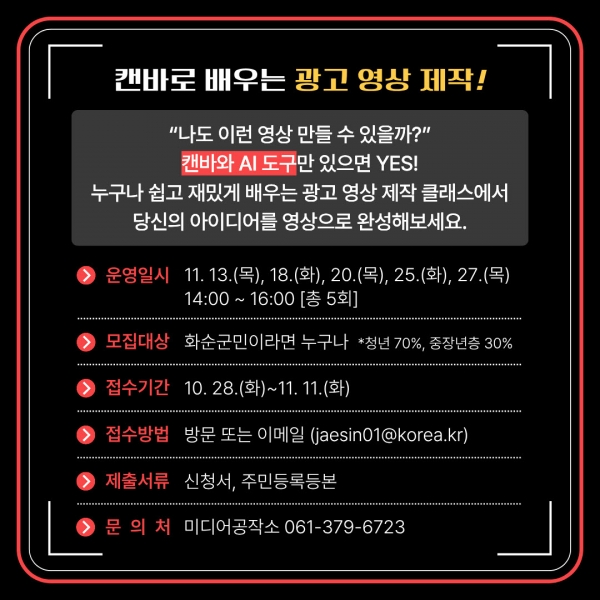 [한국Q뉴스] 화순군은 오는 11월13일 오후 2시 화순군 청년센터 미디어공작소에서 화순군민을 대상으로 AI와 캔바로 배우는 광고영상 제작하기 교육을 진행한다고 밝혔다.