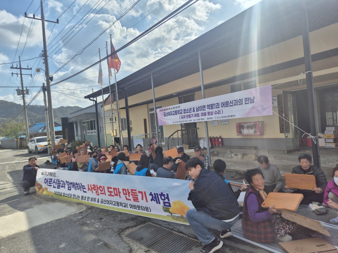 이날 금산여고 동아리 '어바웃타운'청소년 8명이 참여해 주민 40여명과 함께 남이면 역평1리 경로당에서 도마 만들기 체험을 진행하고 마을에 노후화된 평상을 직접 디자인한 등받이 평상으로 교체했다.