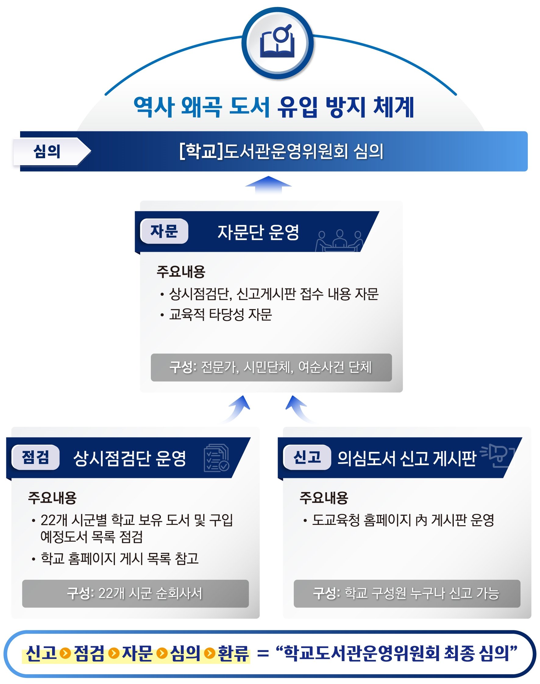 이를 토대로 ▲ 22개 시·군별 상시점검단 운영 ▲도교육청 홈페이지 내 의심도서 신고 게시판 운영 ▲전문가 자문단 운영 등으로 이어지는 ‘신고-점검-자문-심의’단계별 체계를 구축해 현장에 적용하고 있다.