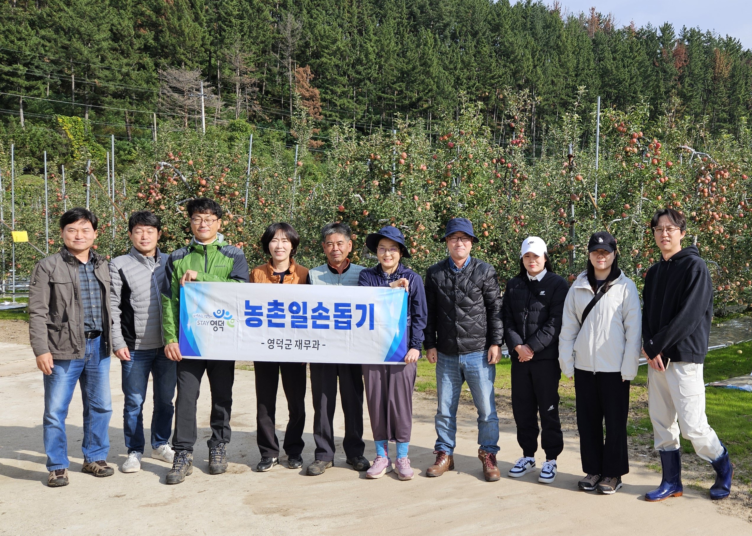 [한국Q뉴스] 영덕군 재무과 직원들이 가을 수확철을 맞아 영해면 묘곡리의 한 사과 농가를 찾아 구슬땀을 흘렸다.