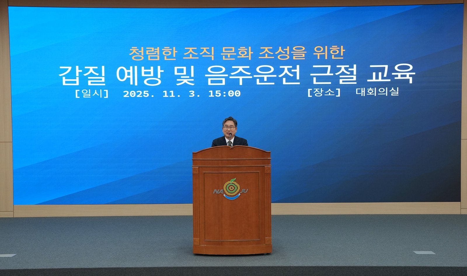 나주시(시장 윤병태)는 지난 3일 시청 대회의실에서 전 직원이 참석한 가운데 ‘갑질 예방 및 음주운전 근절 교육’을 진행했다고 4일 밝혔다.