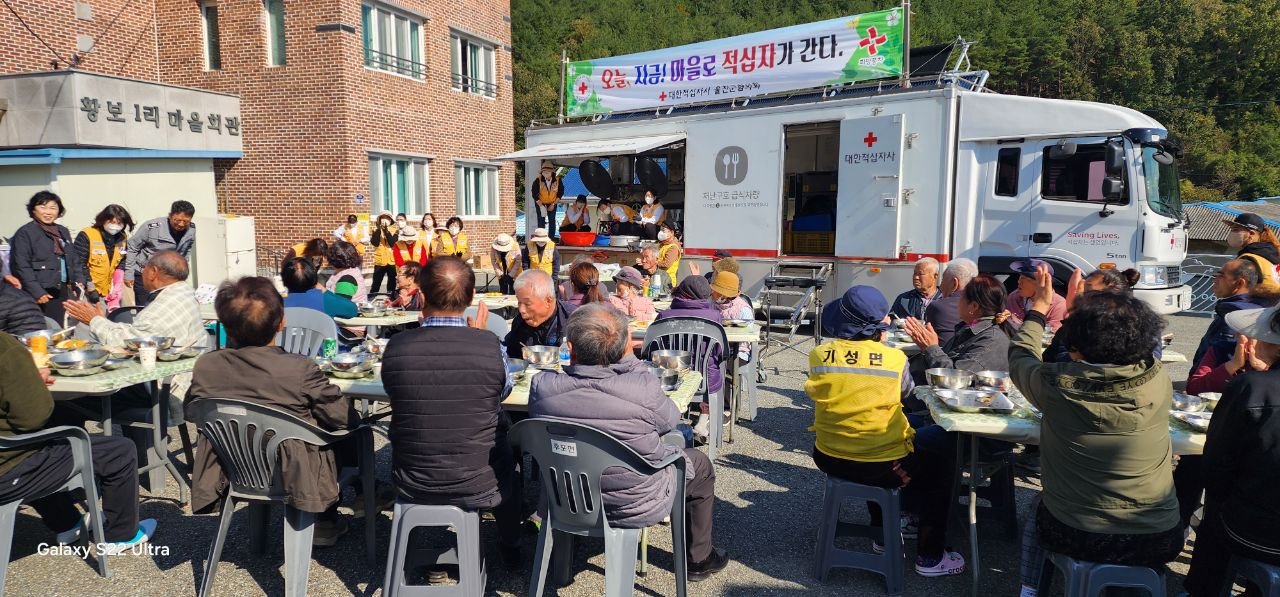 [한국Q뉴스] 대한적십자봉사회 울진군지회(회장 원명순)가 11월 3일 기성면 황보1리 마을회관에서 ‘오지마을 찾아가는 밥차’봉사활동을 펼쳤다.