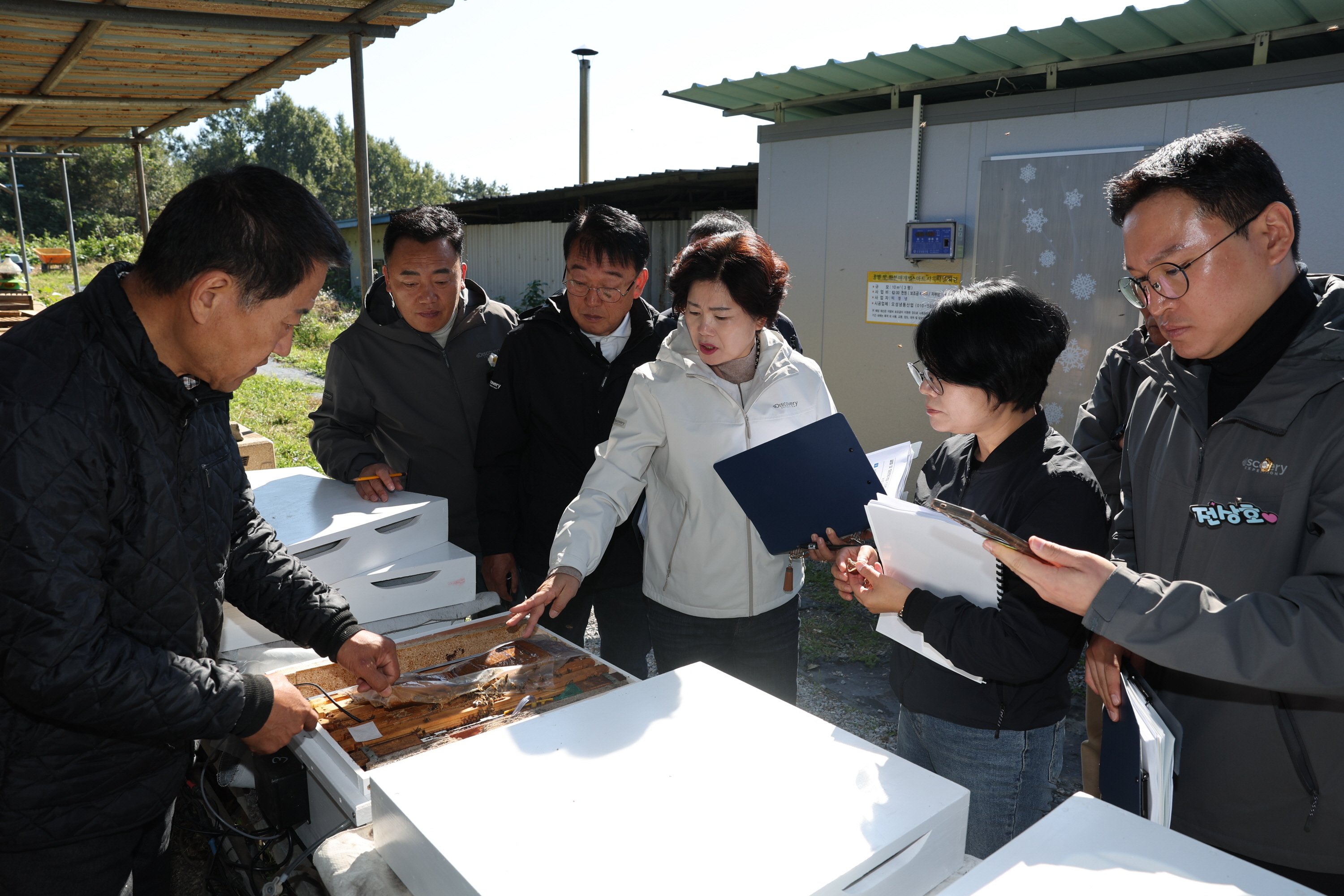 【사진 자료 부연 설명】1-110월 31일 꿀벌 농가에 방문해 월동관리에 적합한 스마트 벌통을 확인하고있다.