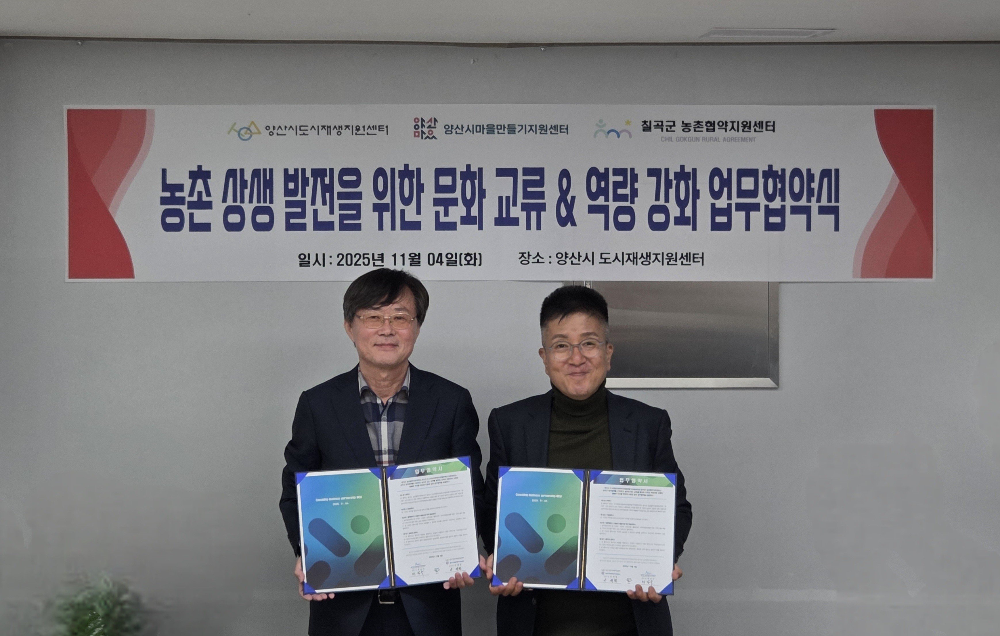 [한국Q뉴스] 양산시도시재생지원센터와 칠곡군농촌협약지원센터는 지난 4일 농촌 상생발전을 위한 문화 교류 및 역량강화 업무협약식을 개최하고 농촌 간의 지속가능한 상생협력 체계 구축을 위해 협약을 체결했다.