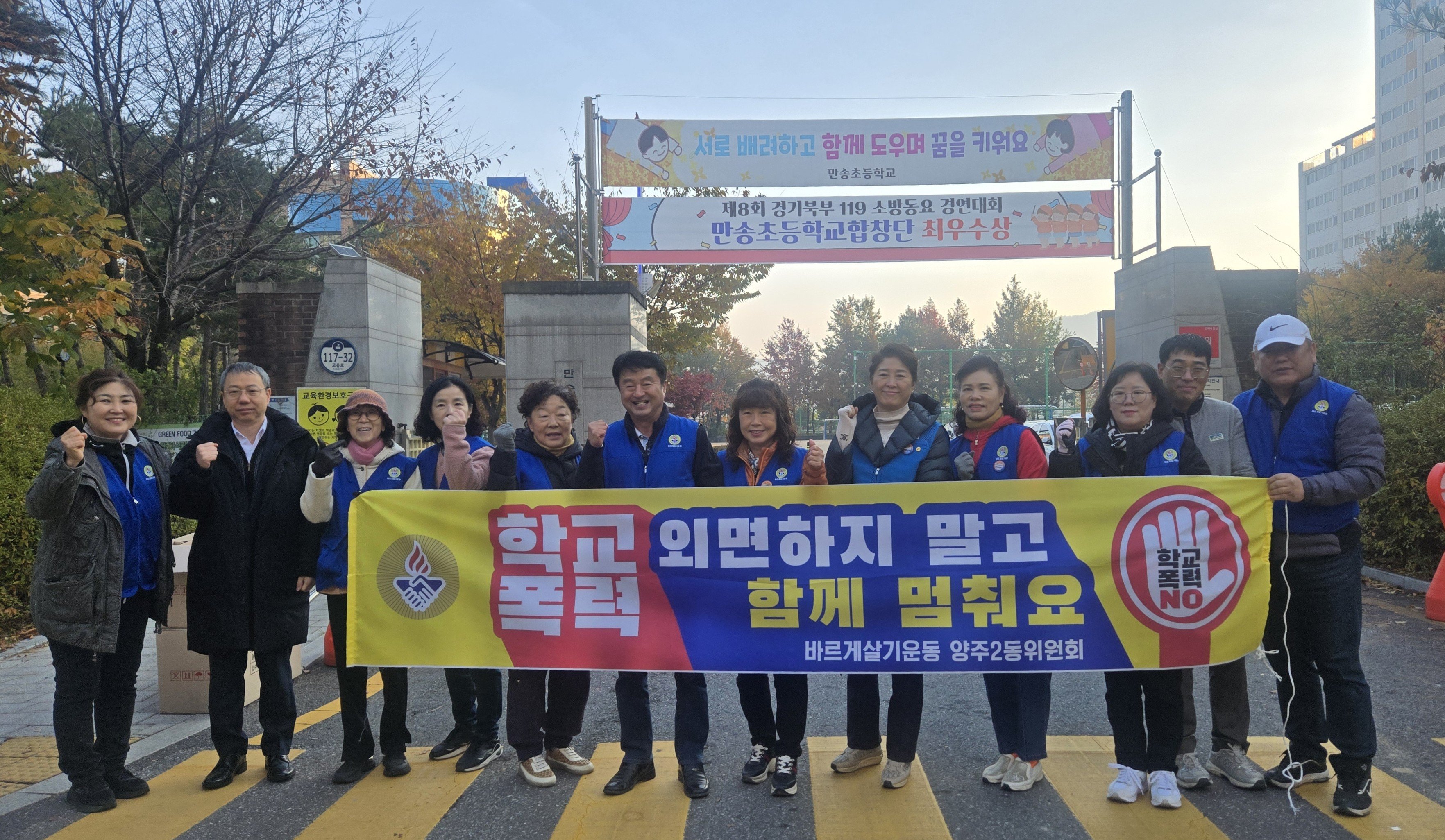 [한국Q뉴스] 양주시 바르게살기운동 양주2동위원회가 지난 4일 오전, 만송초등학교 정문 앞에서 등교하는 초등학생들을 대상으로 ‘학교 폭력 예방 캠페인’을 실시했다.