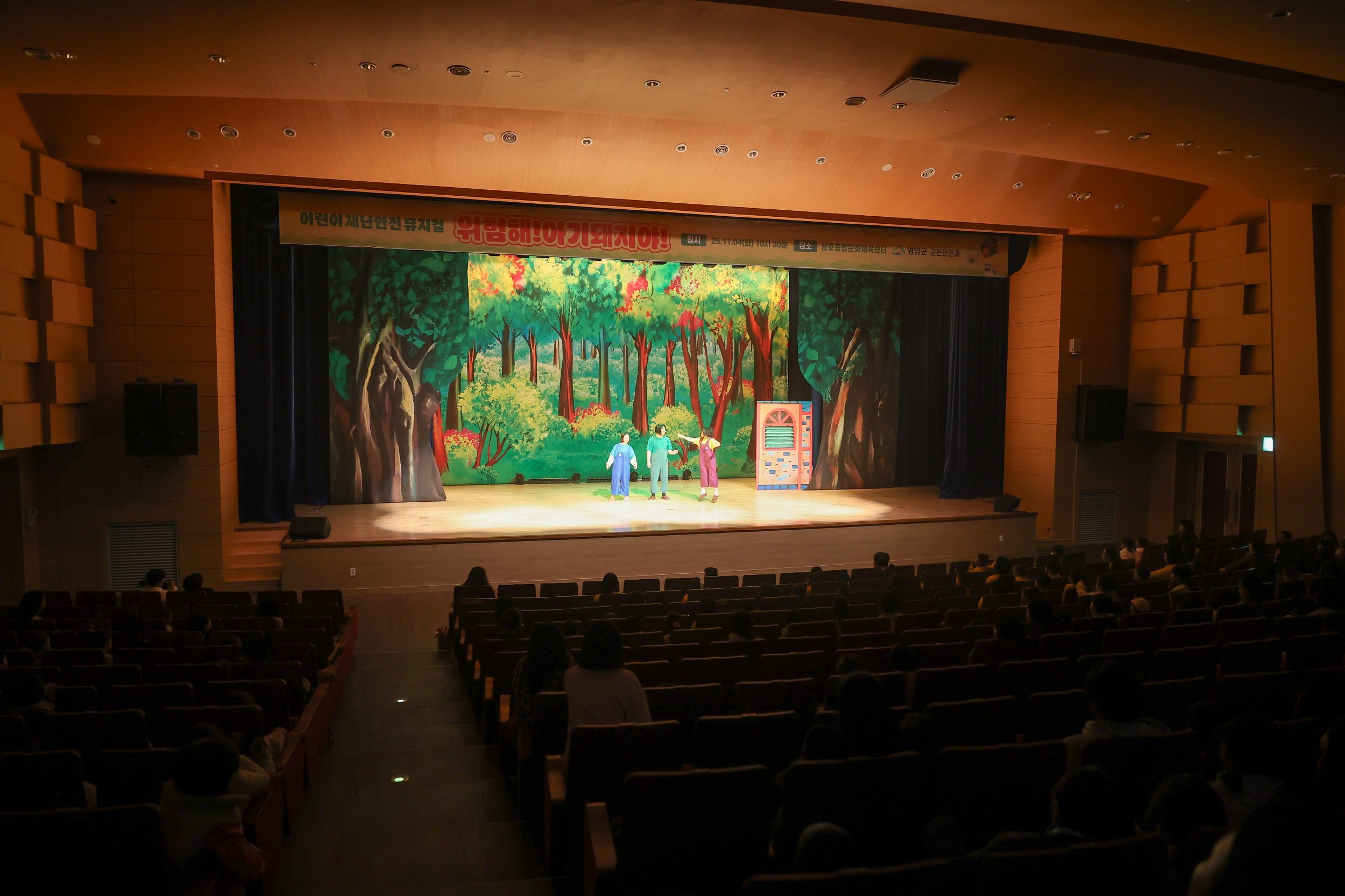 [한국Q뉴스] 영암군이 안전점검의날인 4일 삼호종합문화체육센터에서 어린이 재난안전 뮤지컬 ‘위험해! 아기돼지야!’를 상연했다.