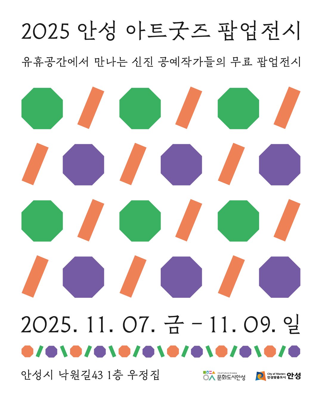 [한국Q뉴스] 안성시는 문화도시 조성사업의 일환으로 11월 7일부터 9일까지 3일간 안성시 낙원길 43 소재의 민간 유휴공간 ‘우정집’에서 ‘2025 안성 아트굿즈 팝업전시’를 개최한다고 밝혔다.