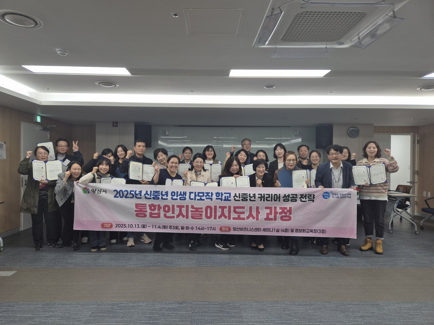 [한국Q뉴스] 양산시는 지난 11월 4일 양산비즈니스센터에서 4층 세미나1실에서 ‘신중년 인생 다모작학교’수료식 및 통합인지놀이지도사2급 자격증 수여식을 가졌다.