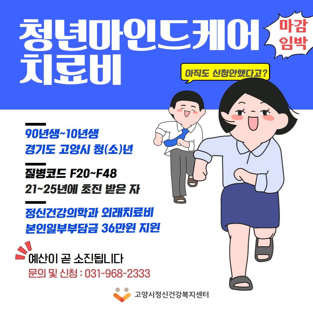 [한국Q뉴스] 고양특례시는 정신건강 취약계층 청년을 대상으로 정신건강의학과 외래 진료비를 지원하는 ‘청년마인드케어’사업을 운영하고 있다.