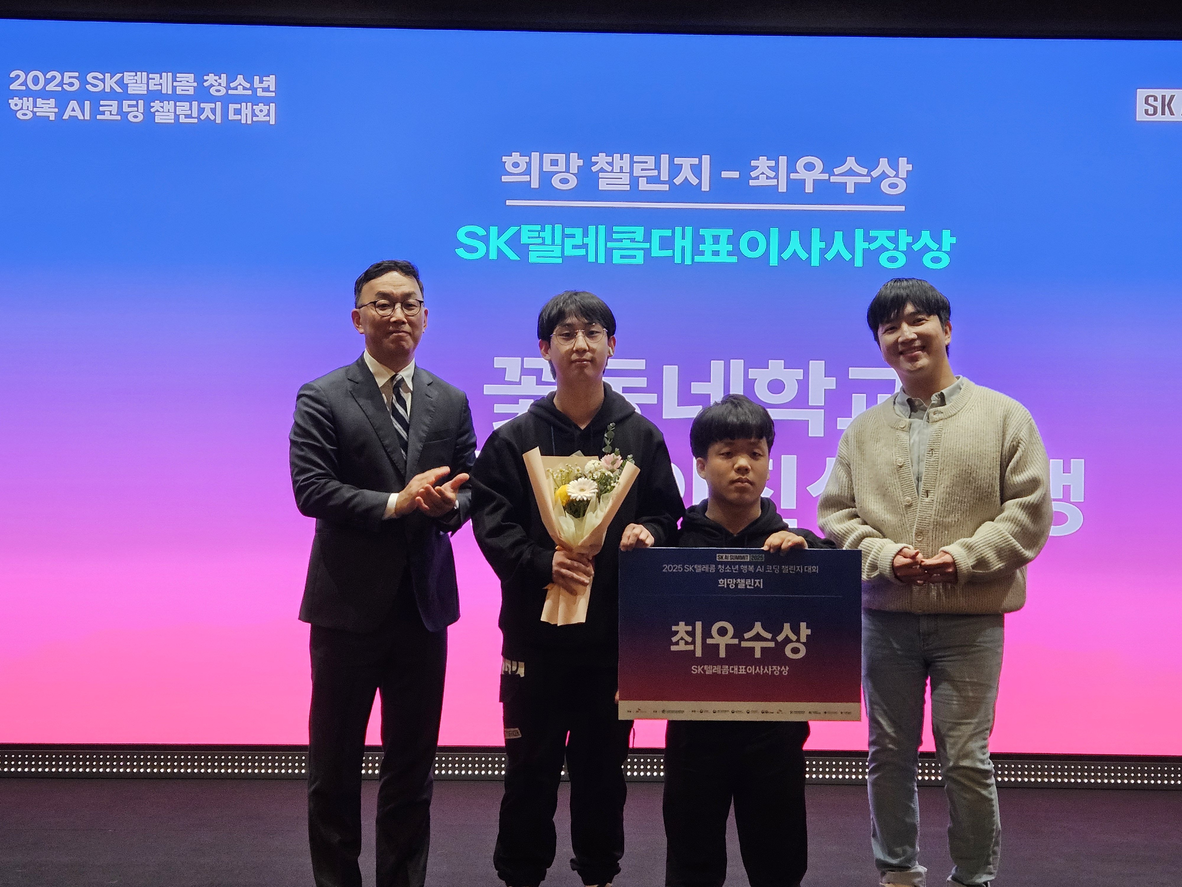 2025 SK텔레콤 청소년 행복 AI 코딩 챌린지 대회 수상자는 △이지환 △이진성 학생으로 두 학생은 AI를 이용한 영상편집 과제에 도전하는 희망 챌린지 부문의 최우수상을 차지했다.