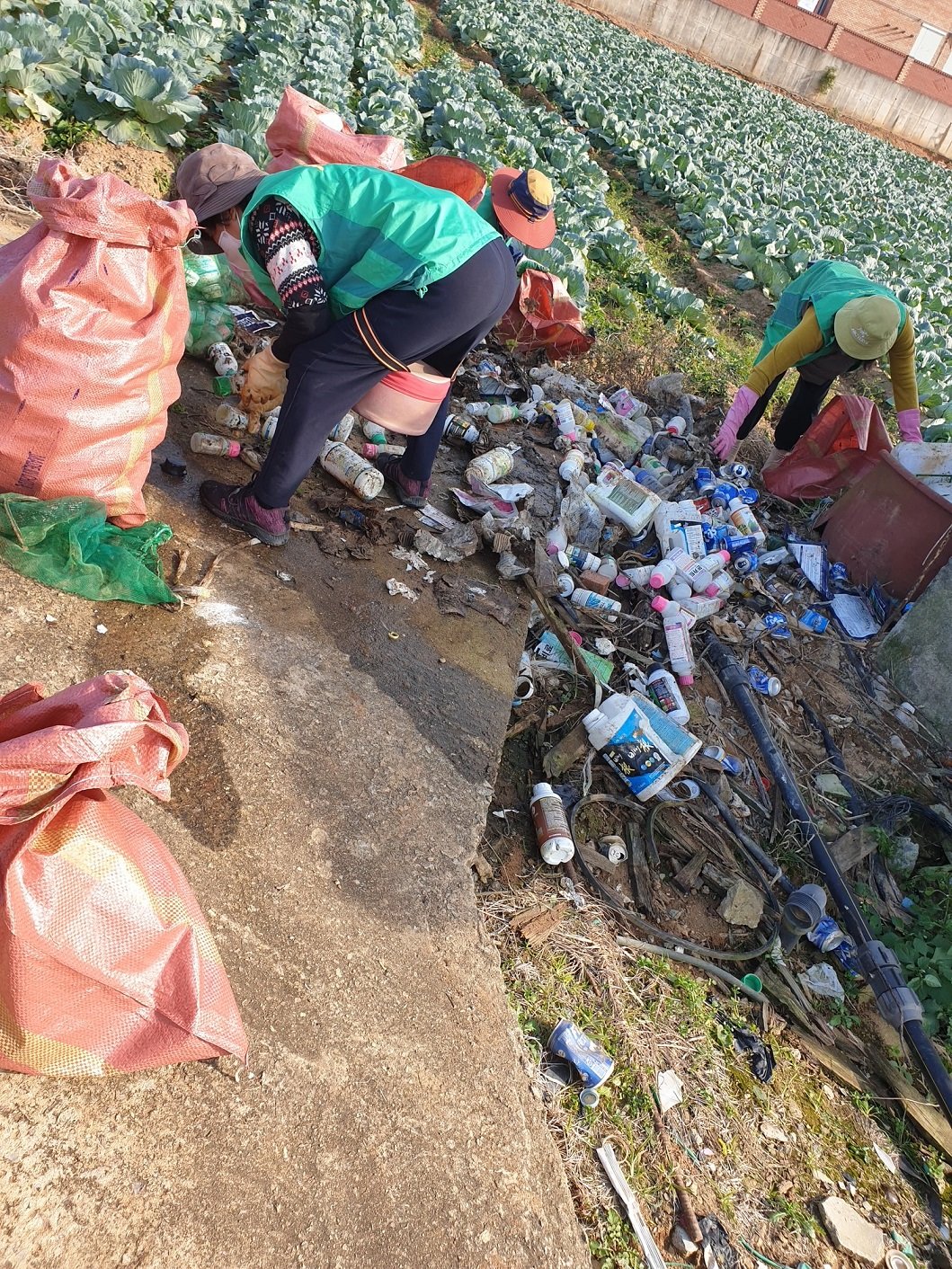현경면 새마을부녀회는 농경지, 하천, 도로변 등에 있는 농약 빈 병을 수거해 품목별로 분리하는 작업을 진행했다.
