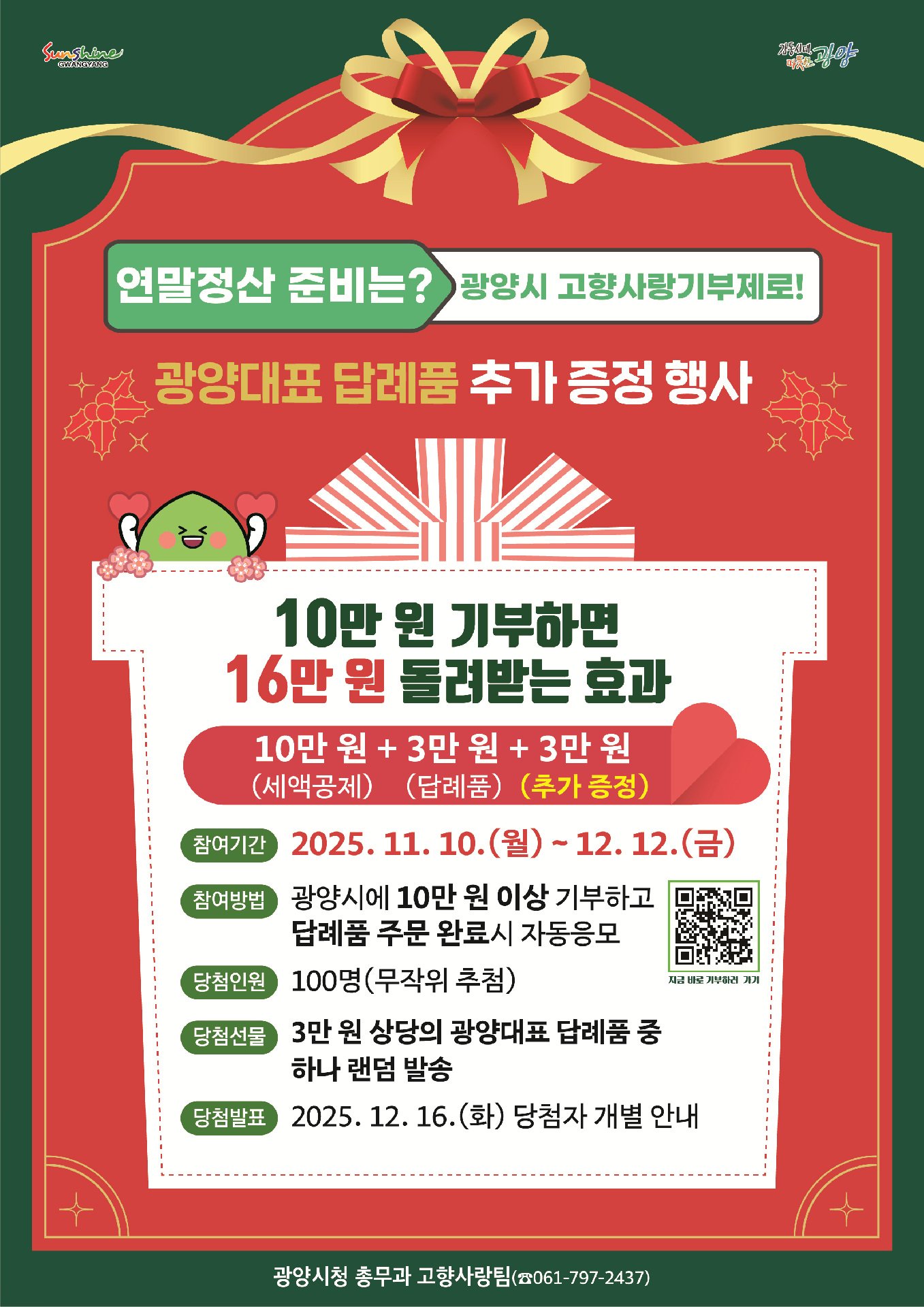 광양시에 10만원 이상 기부하고 답례품 신청을 완료한 기부자 중 100명을 추첨 프로그램을 통한 무작위 방식으로 선정하며 당첨 시 기본 세액공제 및 답례품 혜택 외 3만원 상당의 광양 대표 답례품이 추가로 제공된다.