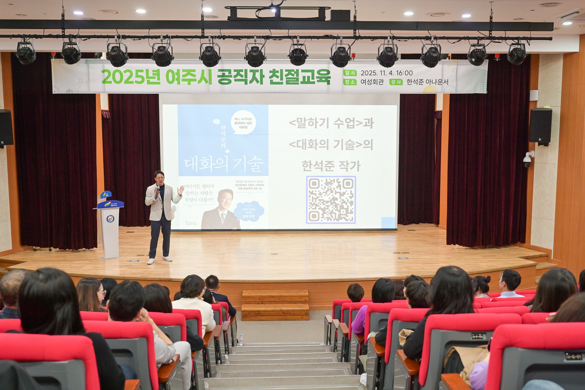 [한국Q뉴스] 여주시는 지난 11월 4일 여성회관 공연장에서 친절교육 희망하는 직원들을 대상으로 공직자들의 시대에 부응하는 고객만족 서비스 향상과 민원인과 관계에서 중요한 소통의 기술 향상을 위해 ‘2025년 여주시 공직자 친절교육’을 진행했다.