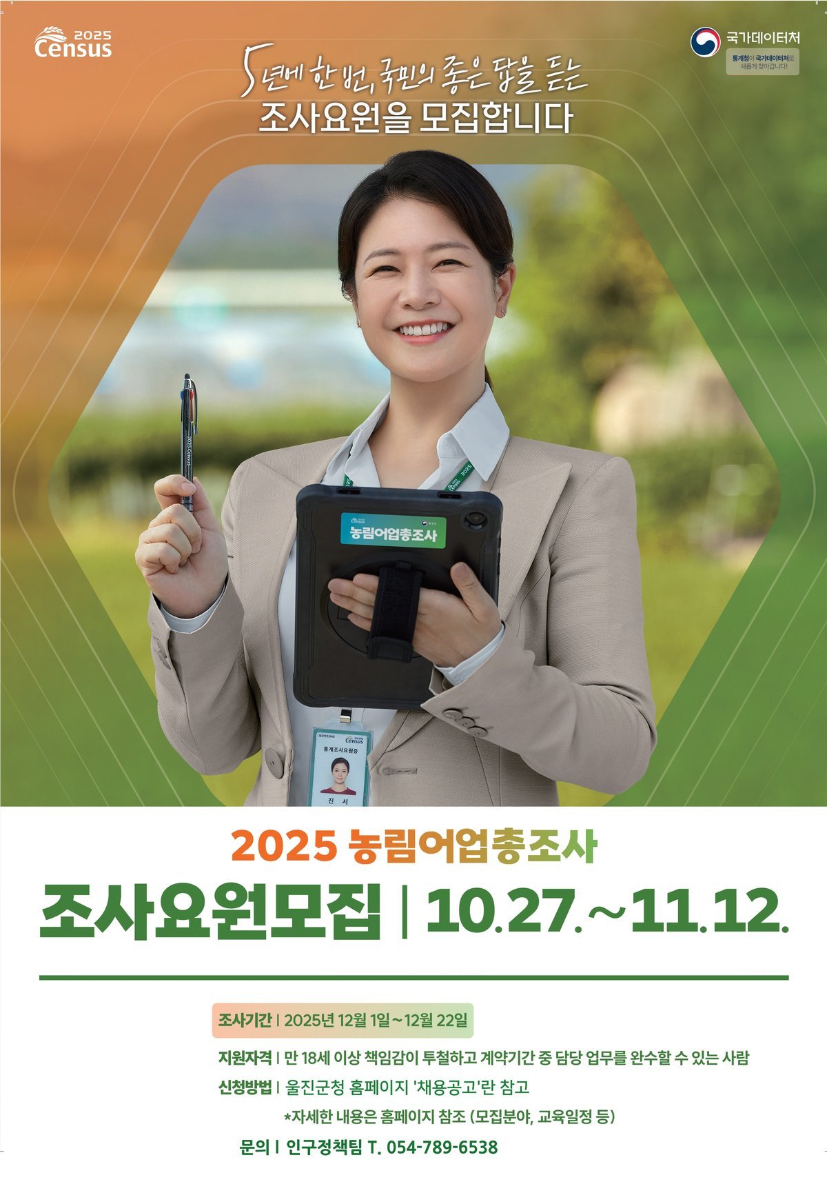 [한국Q뉴스] 울진군은 오는 12월 실시되는 ‘2025 농림어업총조사’의 원활한 추진을 위해 조사요원 67명을 모집한다.