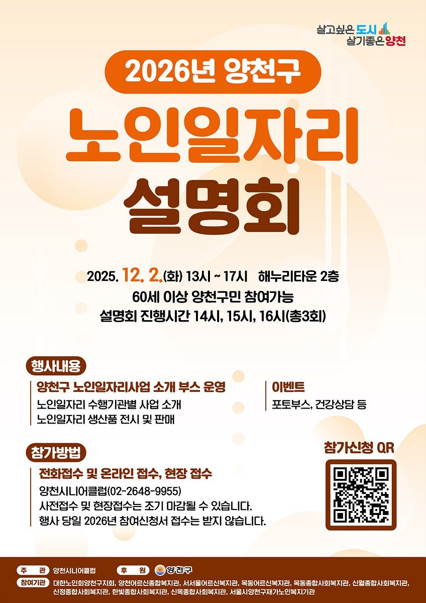 행사 참여를 원하는 어르신은 이달 21일까지 양천시니어클럽 또는 QR코드를 통해 사전 신청할 수 있으며 행사 당일 현장 접수도 가능하다.
