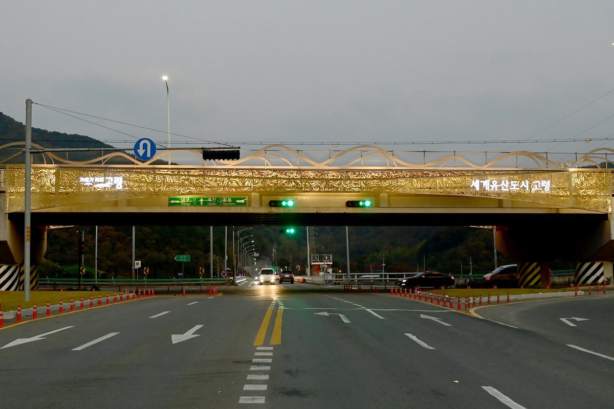 [한국Q뉴스] 고령군은 대가야읍 헌문교차로 고가도로 상부에 대가야의 정체성을 담은 관문형 조형물을 설치 완료했다고 밝혔다.