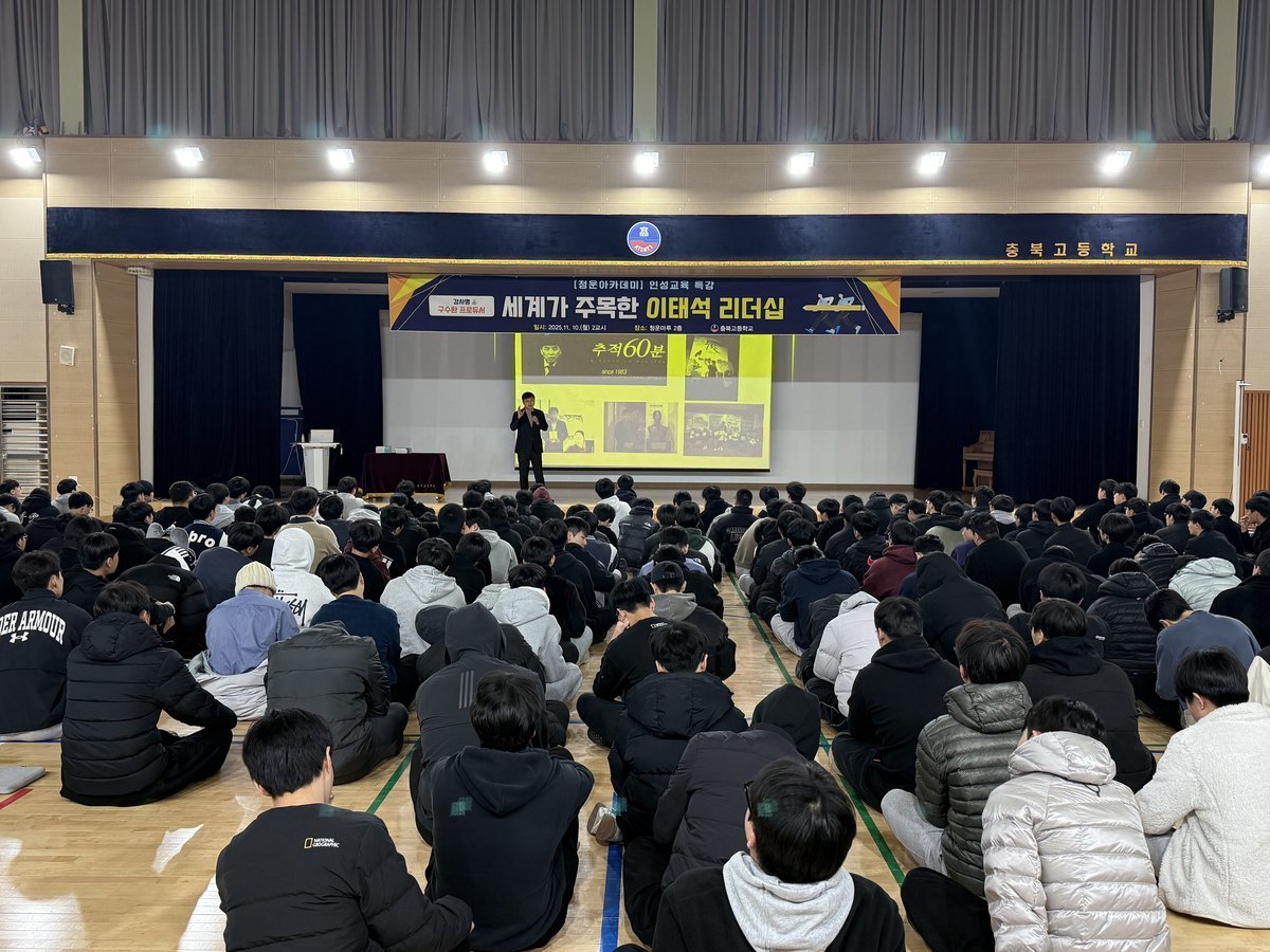 [한국Q뉴스] 충북고등학교는 10일, 2학년 전교생을 대상으로 이태석 재단 이사장인 구수환 프로듀서를 초청해 ‘세계가 주목하는 이태석 리더십’이라는 주제로 인성교육 특강을 개최했다.