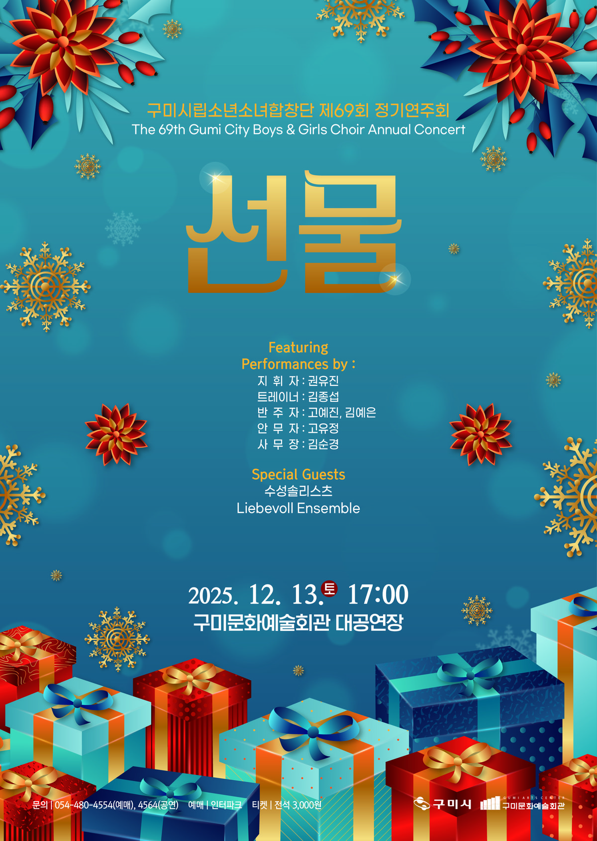 마지막으로 12월 13일 구미문화예술회관 대공연장에 개최 예정인 제69회 구미시립소년소녀합창단 정기공연 ‘선물’은 희망과 따뜻함을 전하는 주제를 아이들의 아름다운 목소리로 나타낼 예정이다.
