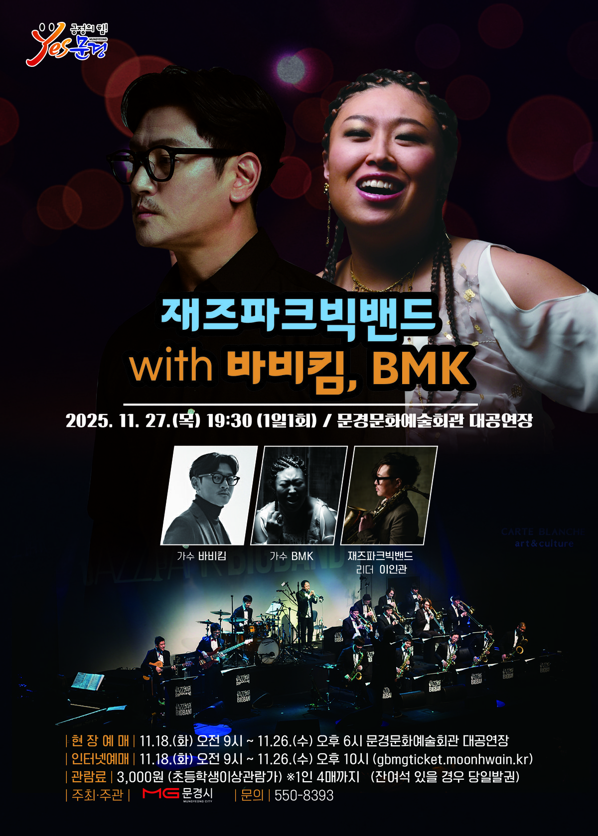 [한국Q뉴스] 문화예술회관에서는 11월 기획공연으로 재즈파크빅밴드 with 바비킴, BMK 공연을 11월 27일 19:30 에 문경문화예술회관 대공연장에서 개최한다.