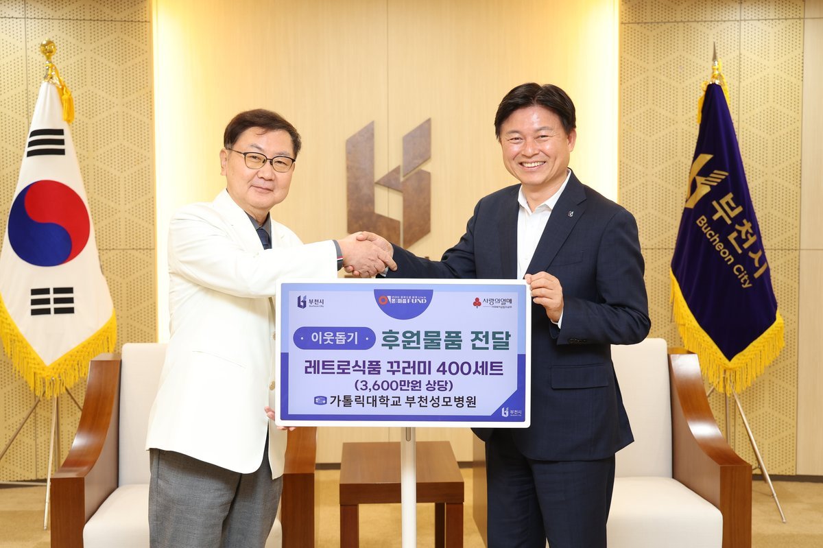 [한국Q뉴스] 부천시는 지난 10일 시청 만남실에서 부천성모병원 성가자선회가 3천600만원 상당의 레트로식품 꾸러미 400세트를 기탁해 전달식을 진행했다고 11일 밝혔다.
