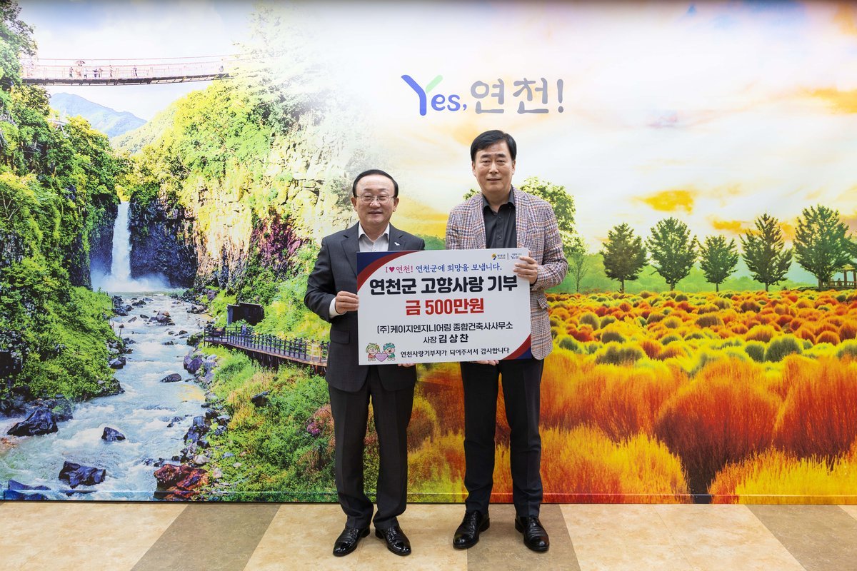 [한국Q뉴스] 연천군은 지난 7일 오후 4시 30분 군수실에서 ㈜케이지엔지니어링 종합건축사사무소 김상찬 사장으로부터 고향사랑기부금 500만원을 전달받았다.