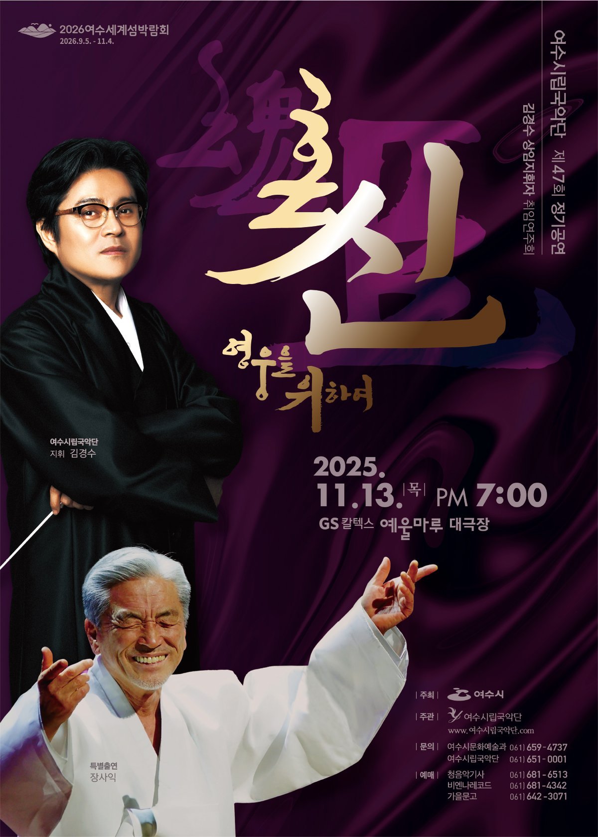 정기명 여수시장은 “이번 정기연주회는 전통과 현대가 어우러진 감동적인 무대가 될 것”이라며 “시민 여러분께서 국악의 깊은 울림 속에서 예술과 역사의 향기를 함께 느껴보시길 바란다”고 말했다.