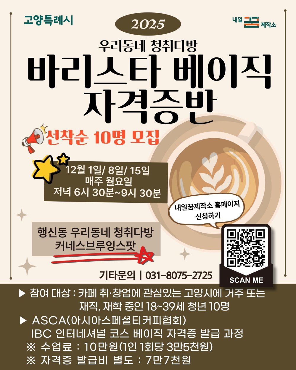 [한국Q뉴스] 고양특례시가 고양시에 거주하거나 활동하는 청년들을 대상으로 카페 취·창업에 적용할 수 있는 ‘바리스타 베이직 자격증반’을 운영한다.