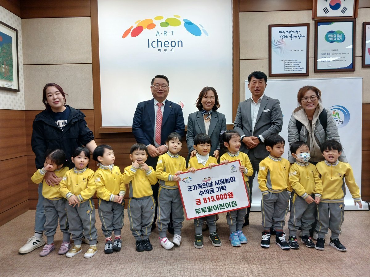 [한국Q뉴스] 이천시 장호원읍 두루말어린이집은 11월 11일 어린이들과 함께 장호원읍행정복지센터에 방문해 군가족의 날 아나바다 시장놀이 행사의 수익금 815,000원을 전달했다.