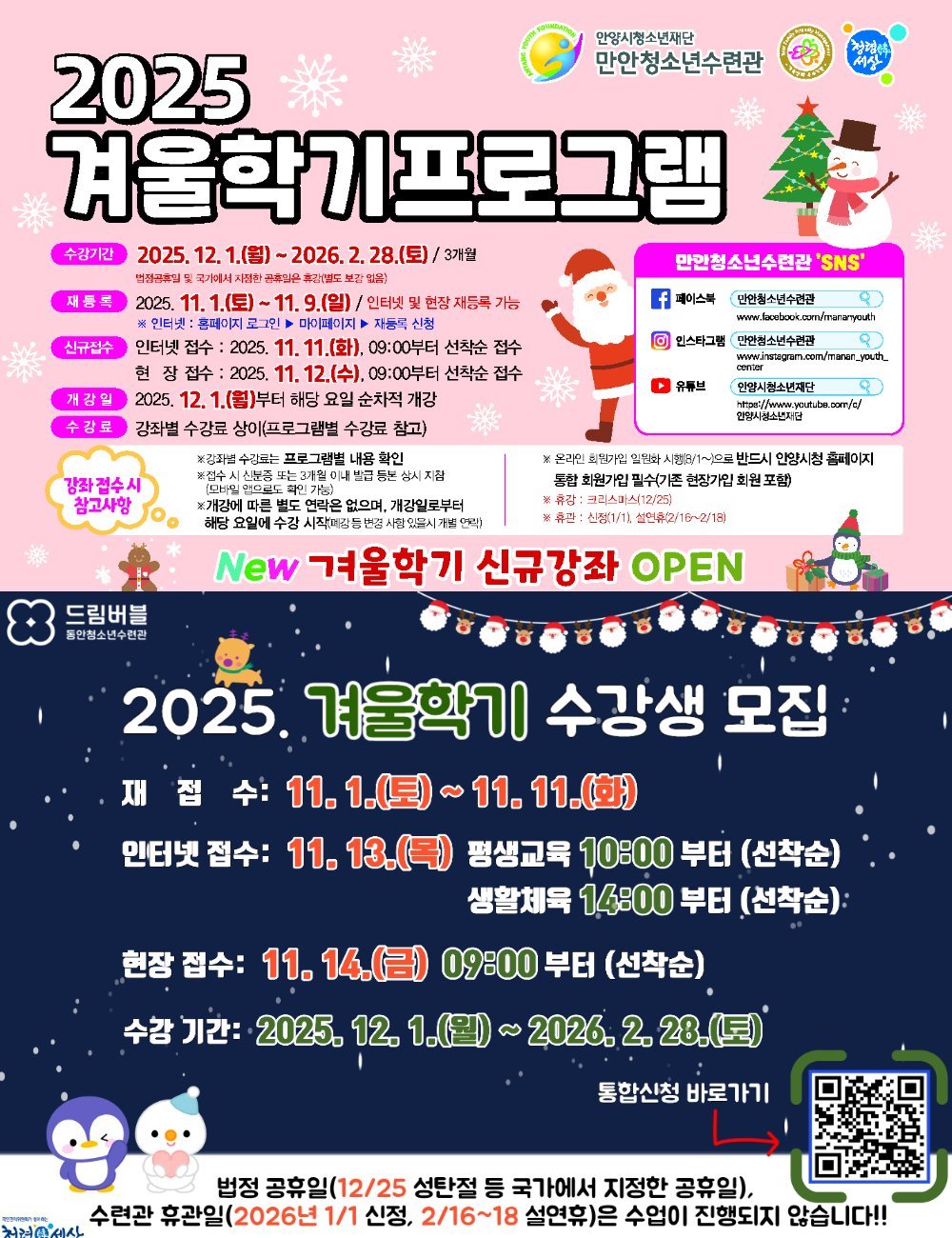만안청소년수련관은 12월 1일부터 2026년 2월 28일까지 겨울학기 프로그램을 운영하며 이번 학기에는 총 124개 강좌 225개 반이 개설되어 배드민턴, 탁구 등 체육활동부터 역사·과학·영어·요리·피아노 등 다양한 분야의 교육 콘텐츠를 제공한다.