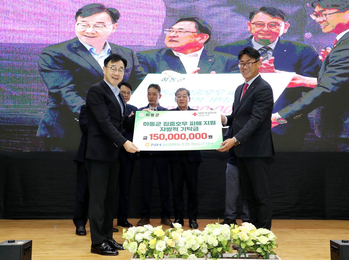 한편 기탁식에서는 농협 하동군지부가 집중호우 피해 군민들의 생활 안정을 위해 1억 5천만원을 기부했고 한국농촌지도자 하동군연합회가 고향사랑기부금 500만원을 전달했다.