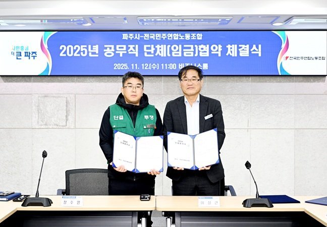 [한국Q뉴스] 파주시는 전국민주연합노동조합 파주시지부와 지난 12일 ‘2025년 단체·임금협약’을 체결했다고 밝혔다.