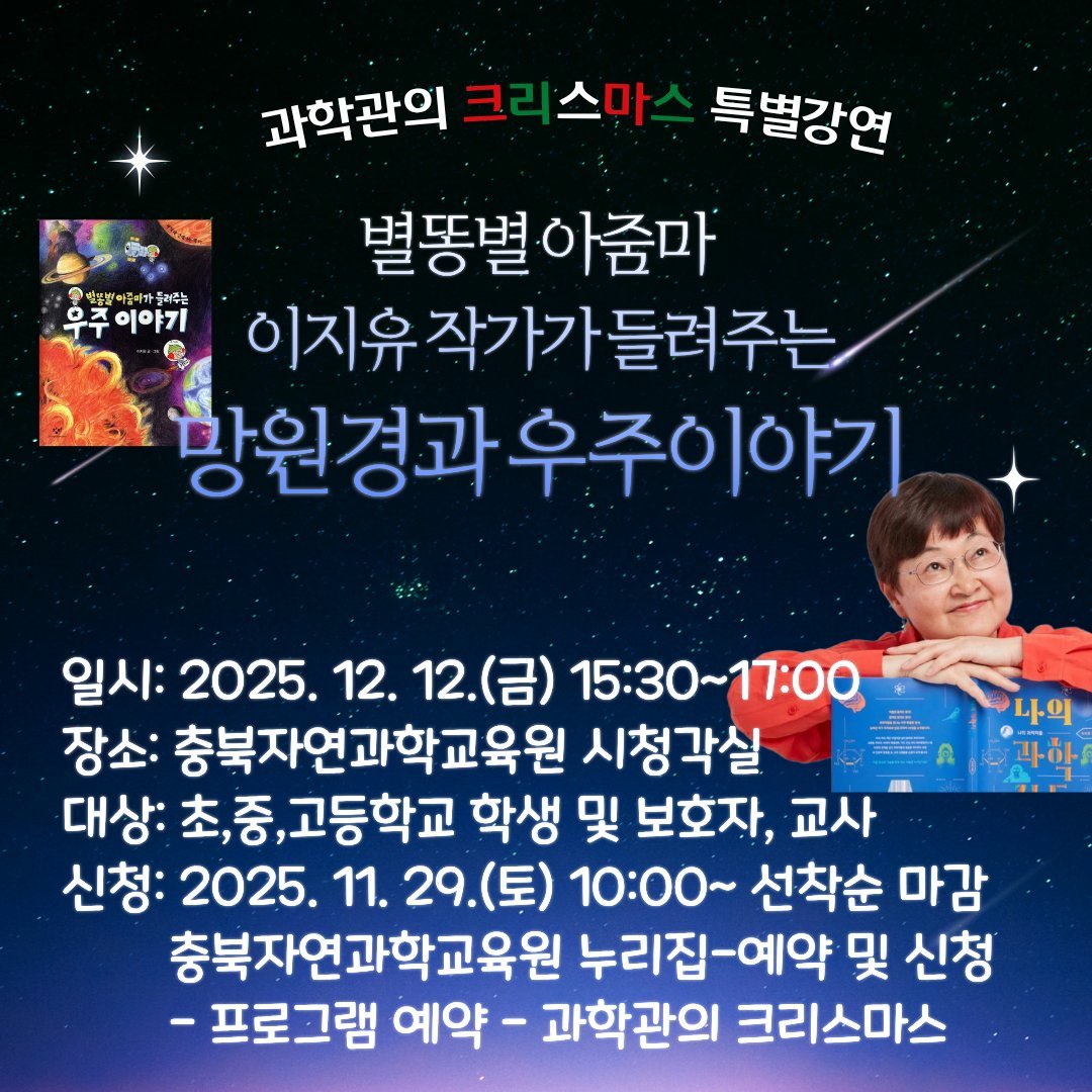 [한국Q뉴스] 충청북도교육청 직속기관 자연과학교육원은 크리스마스 주간 운영 프로그램의 일환으로, 별똥별 아줌마가 들려주는 과학이야기 시리즈로 잘 알려진 이지유 작가를 초청해 오는 12월 12일 오후 3시 30분부터 특별강연을 운영한다.