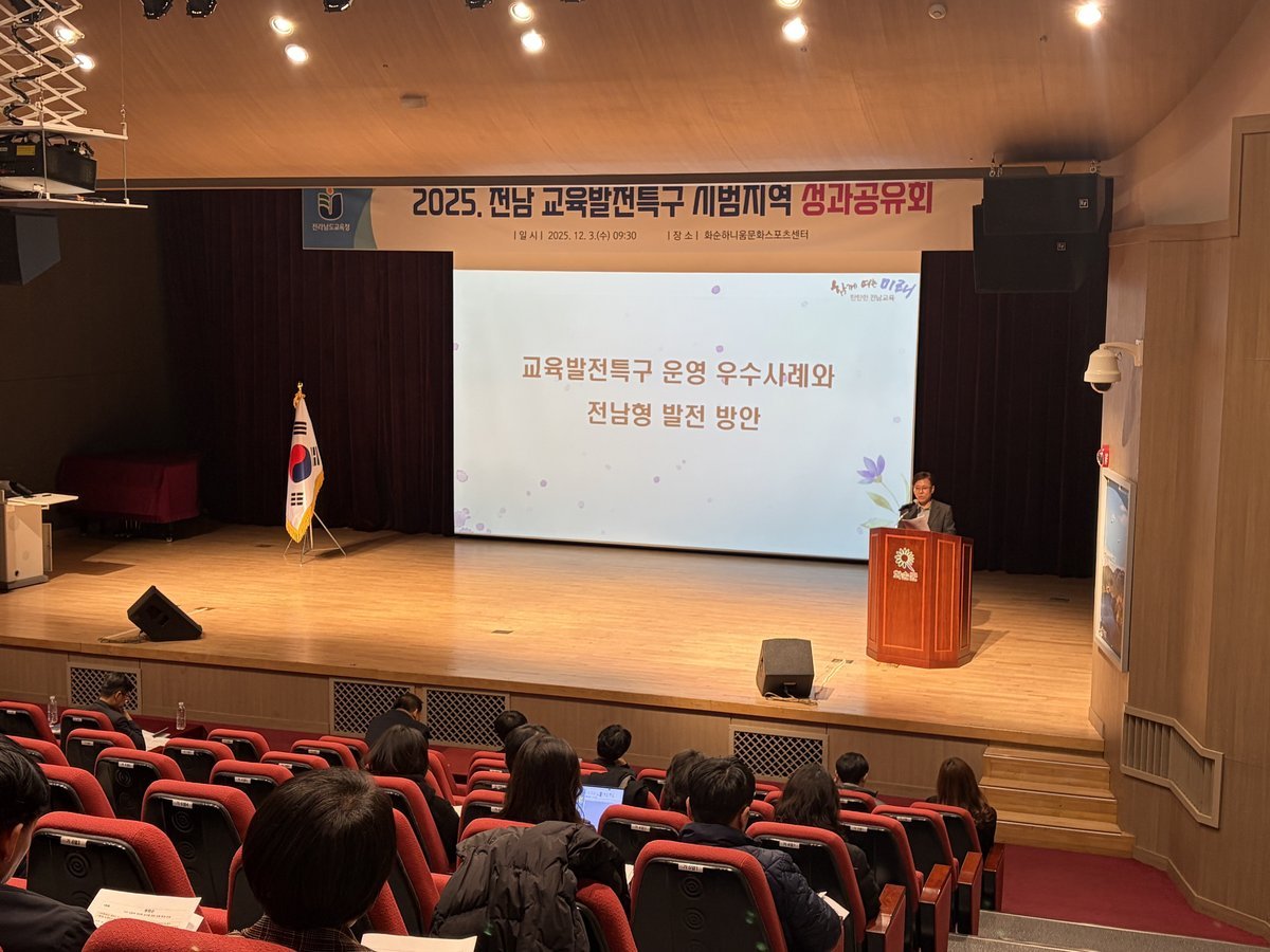 [한국Q뉴스] 전라남도교육청이 12월 3일 화순하니움문화스포츠센터에서 ‘2025. 교육발전특구 시범지역 교육청-지자체 합동 성과공유회’를 열어 교육발전특구 사업 추진 경과를 돌아보고, 2027년 교육발전특구 정식 지정을 위한 향후 과제를 논의했다.