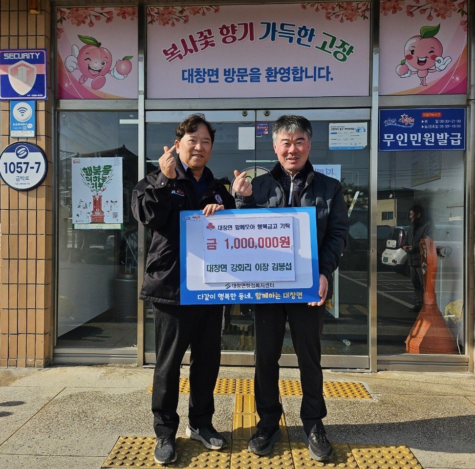 박상우 대창면장은 “지역 복지를 위해 지속적으로 도움을 주신 김봉섭 이장님께 깊이 감사드린다”며, “기탁해주신 성금은 어려운 이웃들에게 소중히 전달하겠다”고 밝혔다.
