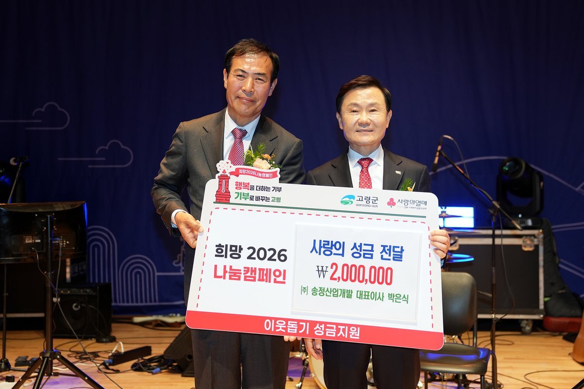 ㈜송정산업개발은 고령군 다산면에 소재한 토공사업 업체로 이웃사랑 실천을 통해 지역사회에 따뜻한 나눔을 전하고 있으며 이번에 기탁한 성금은 고령군 관내 저소득 계층을 위해 사용될 예정이다.