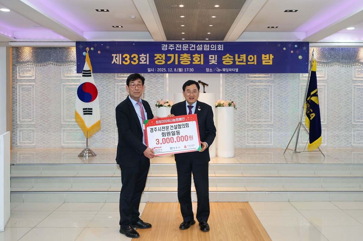 주낙영 경주시장은 “매년 연말 어려운 이웃을 위해 따뜻한 정성을 모아주시는 전문건설협의회에 깊이 감사드린다”며 “성금은 취약계층 복지 향상을 위해 소중하게 사용하겠다”고 말했다.