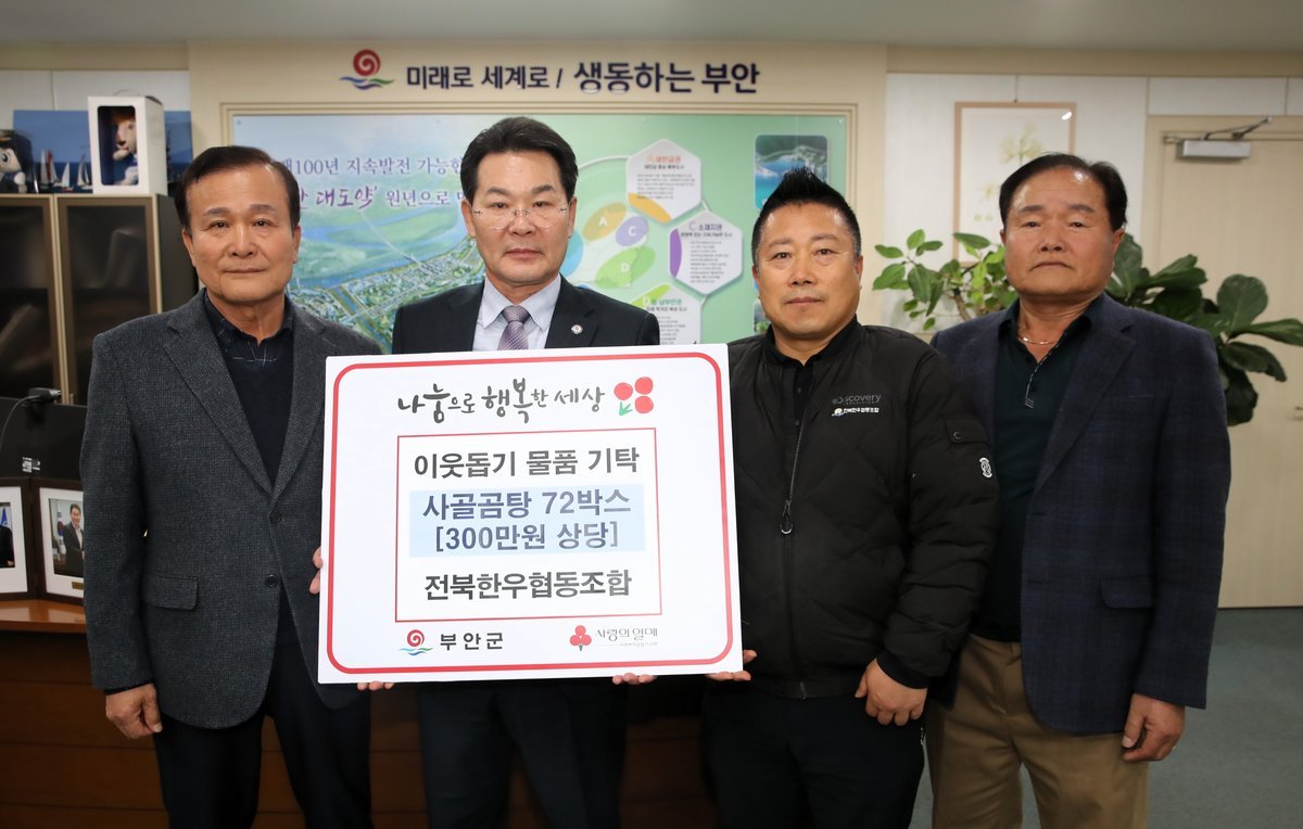 권익현 부안군수는 “뜻깊은 나눔을 실천해 주신 전북한우협동조합에 깊이 감사드린다”며, 기탁해 주신 사골곰탕은 도움이 필요한 이웃들에게 따뜻한 마음과 함께 잘 전달하겠다”고 말했다.